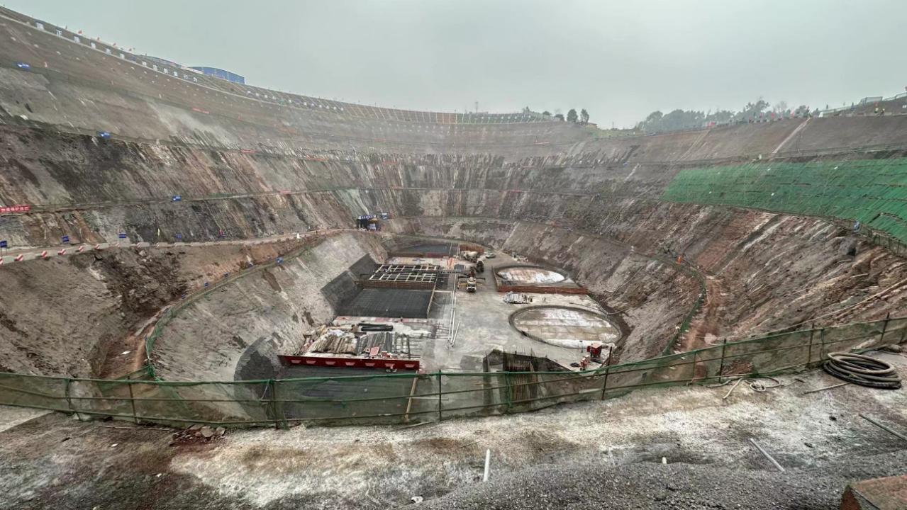 人民网重庆2月21日电?(焦磊?胡虹)二月底的渝西,细雨蒙蒙。在重庆市江津区油溪镇金刚社区长江左岸,一个80余米的大坑深嵌于起伏的小山丘之中,无数粗细不一的管线整齐密织着坑底,宛若一张地毯。泥罐车喷出股股泥龙,施工车辆挥舞着机械臂,沿着坑壁通道盘旋而下,施工团队正在坑底有条不紊地进行着各项施工作业。这里是重庆渝西水资源配置工程最重要的控制性节点工程——金刚沱泵站的施工现场。