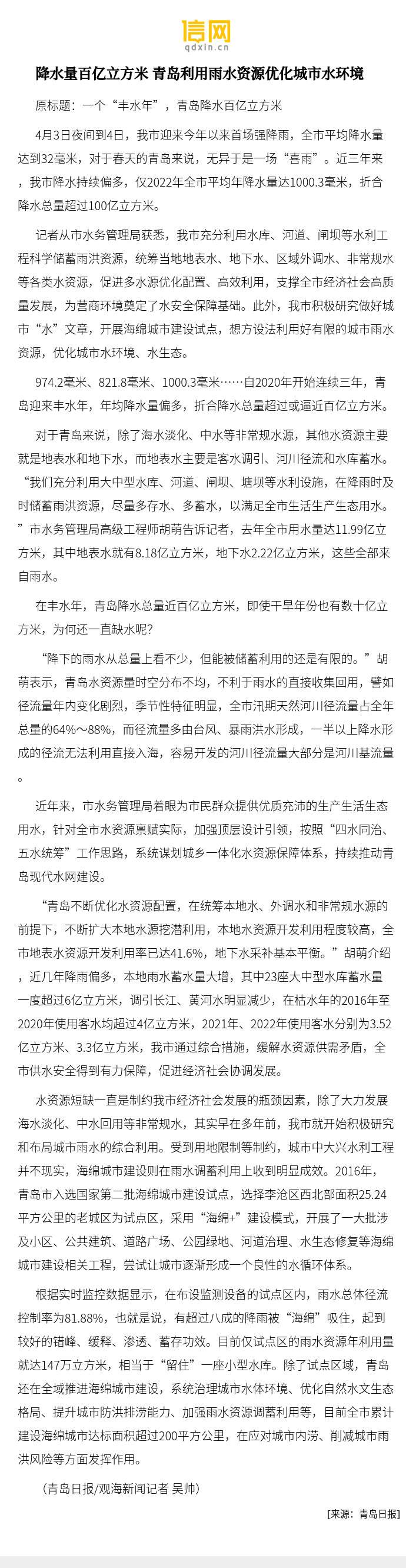 【降水量百亿立方米 青岛利用雨水资源优化城市水环境】市水务管理局着眼为市民群众提供优质充沛的生产生活生态用水,针对全市水资源禀赋实际,加强顶层设计引领,按照“四水同治、五水统筹”工作思路,系统谋划城乡一体化水资源保障体系,持续推动青岛现代水