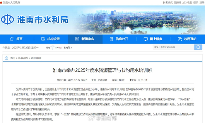 【#淮南市举办2025年度水资源管理与节约用水培训#】为深入贯彻节水优先方针,全面提升全市节约用水和水资源管理业务能力水平,淮南市水利局于12月9日至10日举办2025年度水资源管理与节约用水培训班,各县区水利(农业农村水利、水务)局从事水资源管理与节约用水管理工作业务骨干、重点取用水单位负责人员共计60余人参加培训。via淮南市水利局
